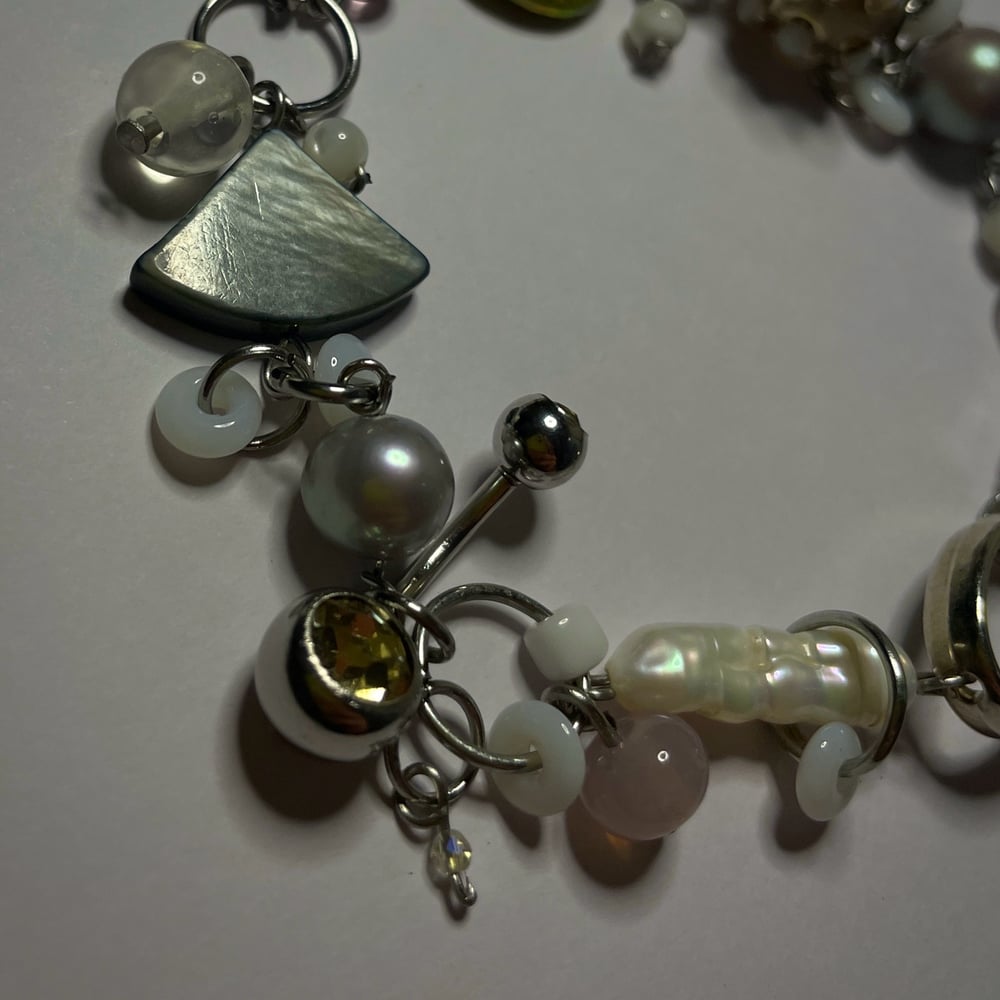 *ੈ✩‧₊• 1-of-1 bracelet featuring freshwater pearl, mother of pearl, czech glass, lampwork, & glass beads. freshwater pearl hand-painted by me. stainless steel findings, metal clasp & chain.